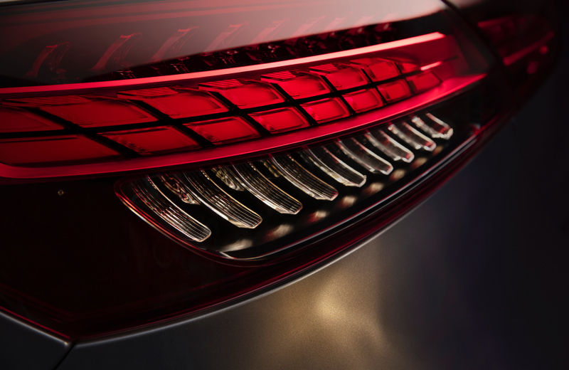 点阵式LED尾灯 - 承袭S级轿跑车的LED尾灯设计,LED光源呈点阵状排列,映射出如龙鳞凤尾般的大气磅礴;横向排列的反光板如同凤凰羽毛,漫反射的柔和光源璀璨辉然,让气势优雅展现。